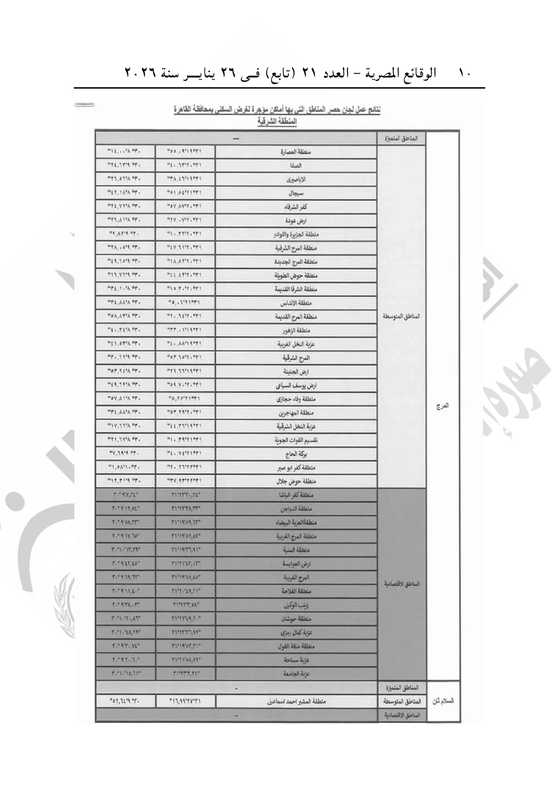 بناءً على ما انتهت إليه لجان الحصر والتقسيم بالمحافظة، نصت المادة الأولى من القرار على تقسيم المناطق التي بها أماكن مؤجرة لغرض السكنى والخاضعة للقانون الجديد إلى ثلاث فئات محددة بالألوان كالتالي: