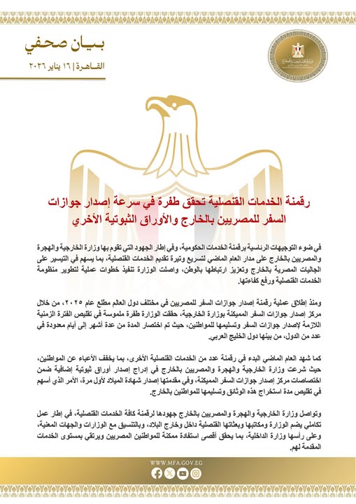 كما شهد العام الماضي البدء في رقمنة عدد من الخدمات القنصلية الأخرى، بهدف تخفيف الأعباء عن المواطنين. ومن أبرز هذه الخطوات إدراج إصدار أوراق ثبوتية إضافية ضمن اختصاصات مركز إصدار جوازات السفر المميكنة، وعلى رأسها إصدار شهادة الميلاد لأول مرة، مما أسهم في تقليص مدة استخراج هذه الوثائق وتسليمها للمواطنين بالخارج.